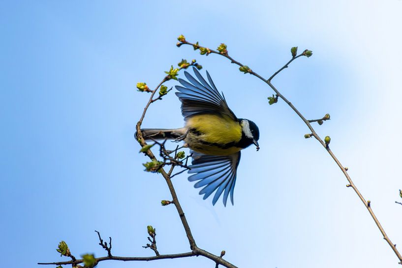 Ein lebendiger Moment eingefangen: eine Kohlmeise im vollen Flug zwischen frischen Frühlingszweigen. Die ausgebreiteten Flügel und leuchtenden Farben bilden einen wunderschönen Kontrast zum sanften, blauen Hintergrund. Dieses Foto strahlt Freiheit, Leichtigkeit und die erste Energie des Frühlings aus – ein raffinierter Blickfang, der…