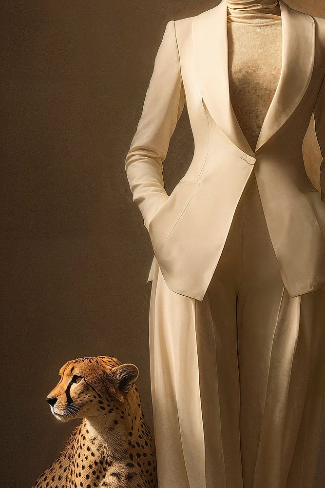 Ein elegantes Porträt einer Frau, die selbstbewusst in einem raffinierten, maßgeschneiderten weißen Anzug steht. Sie hat einen kontrollierten Ausdruck, mit dem sie eine Aura der Anmut ausstrahlt. Neben ihr steht ein wacher und gelassener Gepard, dessen geflecktes Fell einen schönen Kontrast zum Outfit der Frau bildet. Der Hintergrund…