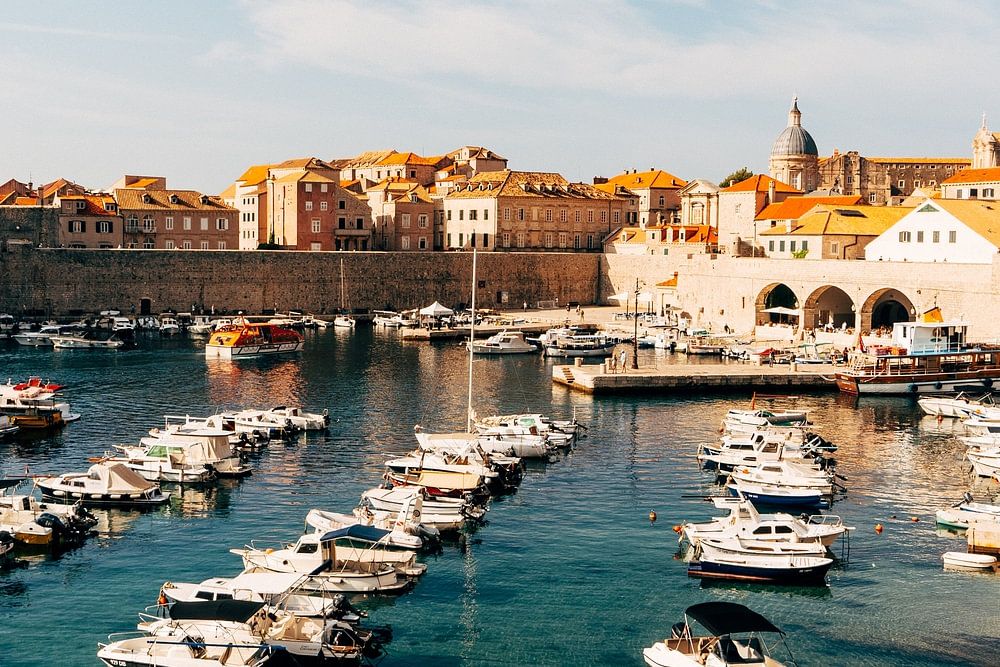 Tauchen Sie ein in eine Welt, in der Geschichte, Natur und Film zusammenkommen - willkommen in Dubrovnik, Kroatien, der "Perle der Adria". Dieses bezaubernde Foto zeigt den malerischen alten Hafen von Dubrovnik, wo das klare blaue Wasser sanft gegen die jahrhundertealten Stadtmauern schwappt und charmante Boote friedlich in der Sonne dümpeln. Hinter den Palmen erheben sich die charakteristischen orangefarbenen Dächer der Altstadt, ein Labyrinth aus mittelalterlichen Straßen und barocken Kirchen, die von einer reichen Vergangenheit zeugen.