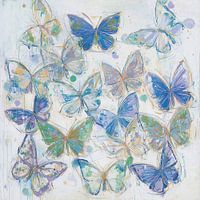 Ein tanzender Schmetterlingsschwarm, der einem poetischen Traum entsprungen zu sein scheint. Jeder einzelne ist einzigartig in Form und Farbe: von tiefem Indigo bis zu transparentem Lila, von zartem Grün bis zu warmen Pfirsichtönen. Der vordergründig weiße Hintergrund ist von spontanen Farbspritzern in Pastellgrün, Violett und Türkis…
