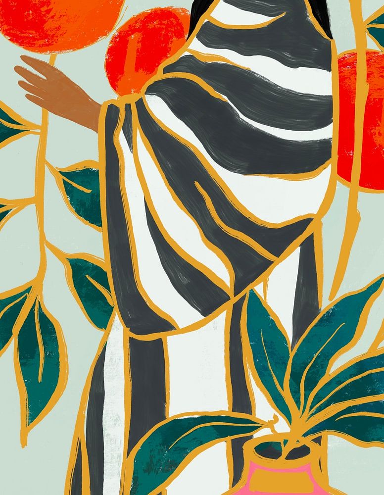 Eine kühne, moderne Illustration einer Frau in einem fließenden, gestreiften Gewand, die inmitten von Orangenbäumen steht und die natürliche Schönheit mit geometrischer Eleganz verbindet. Die leuchtenden Farben und stilisierten Muster vermitteln ein Gefühl von Ruhe, Harmonie und zeitloser Anmut