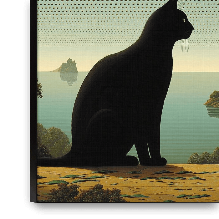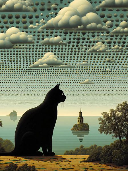 Ein großer, schwarzer Katzenumriss sitzt vorn im Bild und blickt ruhig über eine glatte, stille See, auf der eine kleine Insel mit einem einsamen Kirchturm schwebt. Der Himmel ist surreal: geordnete Reihen winziger Punkte bilden eine Rasterstruktur, aus der weiche, körnige Wolken hervorwachsen — eine Mischung aus Traumlandschaft und…