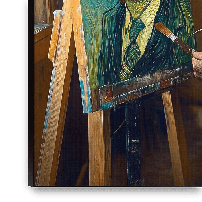 In einem hellen Atelier konzentriert sich ein Maler intensiv darauf, ein Porträt zu malen, das dem berühmten postimpressionistischen Stil ähnelt. In der Hand hält er einen Pinsel und fügt dem Ausdrucksgesicht auf der Staffelei akribisch Details hinzu.