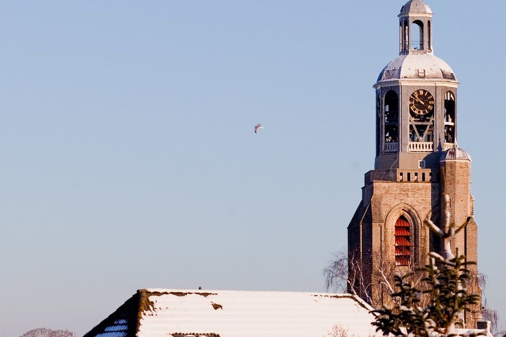 Blick vom Zentrum von Bergen op Zoom auf den Peperbus. Der markante Turm der St.-Gertudis-Kirche ist im Winter unter einer dünnen Schneedecke bei klarem Himmel zu sehen.