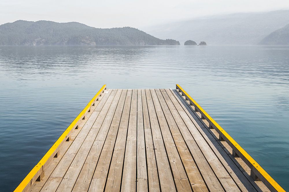 Der Pier der Stadt Harrison Hot Springs in Kanada am frühen Morgen fehlt.