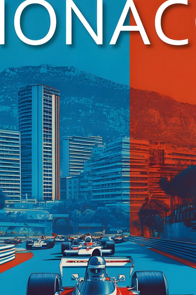 Ein stilisiertes Retro-Poster zeigt ein Formel-1-Rennen auf den Straßen von Monaco. Im Vordergrund rast ein Rennwagen frontal auf den Betrachter zu, dahinter folgen weitere Fahrzeuge entlang der engen Stadtkurve. Die vertikale Farbteilung in Rot und Blau verstärkt Dynamik und Kontrast, während die klare Typografie den ikonischen…