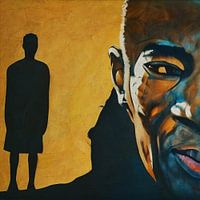 Porträt eines Mannes, der stur nach vorne schaut. Er weiß, dass ihn immer ein Schatten verfolgt, und macht Fortschritte. Wem gehört der Schatten? Ist es sein eigener Schatten aus der Vergangenheit oder ist es der von jemandem, den er kennt? Das ist die Frage, die de kijker zich moet stellen.