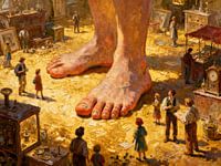 Dieses ungewöhnliche Kunstwerk zeigt eine faszinierende Szene, in der Menschen um die gigantischen Füße eines riesigen Wesens stehen. Die Perspektive lässt den Betrachter die enorme Größe der Figur unmittelbar spüren, während kleine Gruppen von Menschen neugierig, überrascht oder nachdenklich auf das monumentale Ereignis…