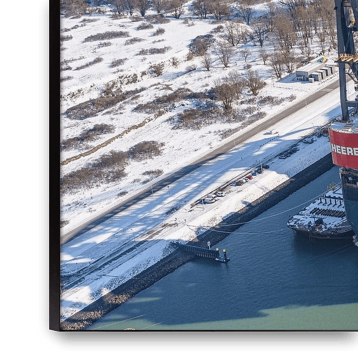Die Sleipnir (das größte Kranschiff der Welt) und ihr etwas kleineres Schwesterschiff, die Thialf, bei winterlichen Bedingungen aus der Luft über dem Caland-Kanal fotografiert.