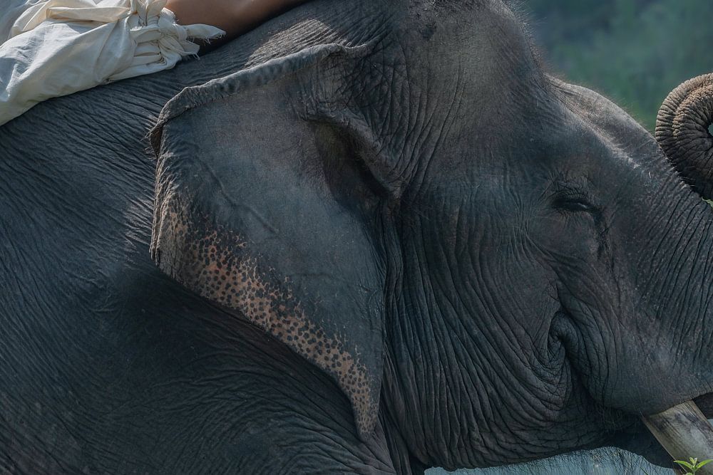 In einem Elefantenschutzzentrum in Riau, Sumatra, Indonesien. Der Sohn des Mahouts macht ein Nickerchen auf dem Rücken eines Elefanten.