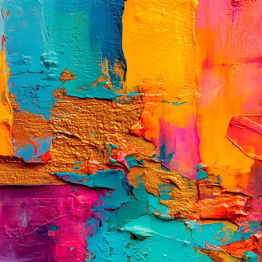Ein abstraktes Gemälde mit einer strukturierten Oberfläche und dicken Farbschichten in einer Farbpalette mit leuchtenden Farbtönen, die durch goldene Akzente einen luxuriösen Look erhalten. Die Komposition ist dynamisch mit kräftigen Pinselstrichen und unregelmäßigen Formen, die Tiefe und Bewegung erzeugen und ein Gefühl von Energie und…