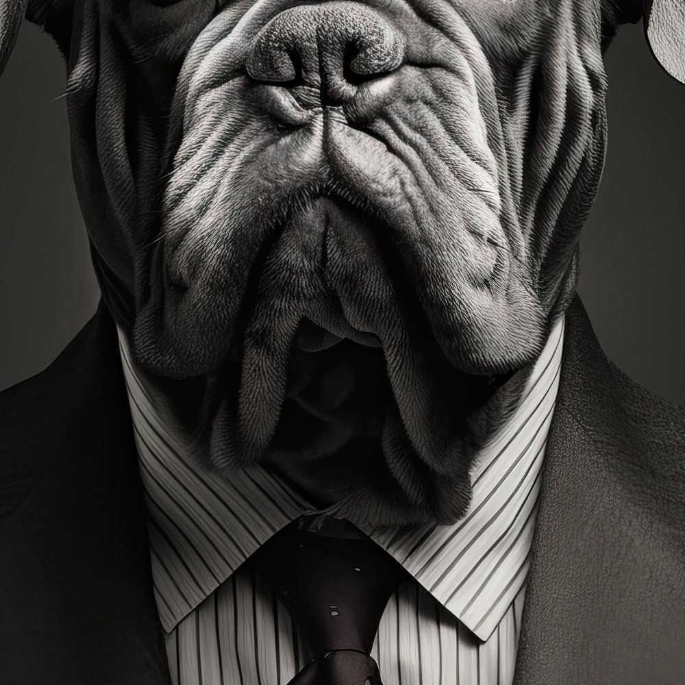 Stellen Sie sich eine Welt vor, in der Hunde Unternehmen leiten und an Sitzungen teilnehmen. Dieser Hund trägt seinen Anzug zu einem bestimmten Zweck, als ob er bereit ist, seine eigenen Träume in der Stadt zu verfolgen.