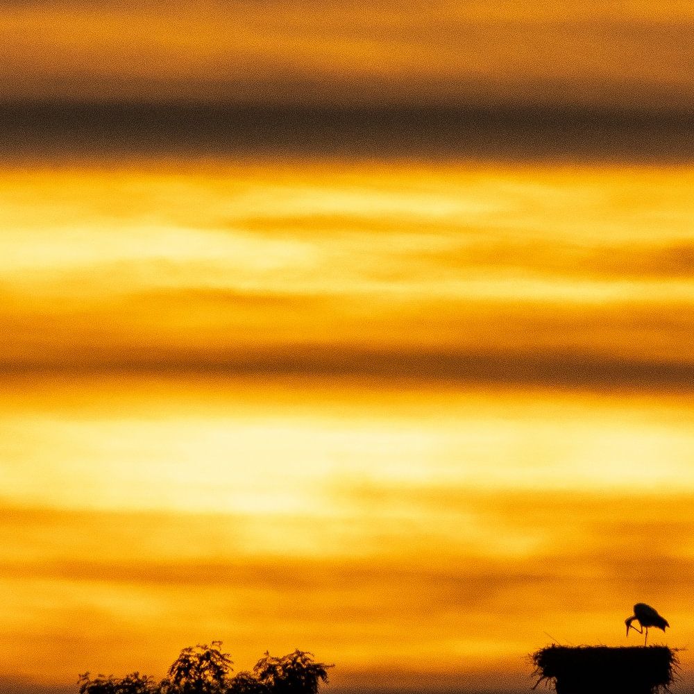 Die Sonne ist gerade hinter dem Horizont verschwunden und verleiht den Wolken einen feurigen Glanz. Die Temperatur sinkt. Der Storch, der einsam auf dem hohen Nest sitzt, putzt sich ein wenig und macht sich bereit, schlafen zu gehen.