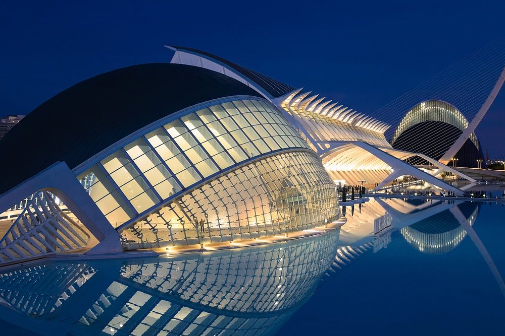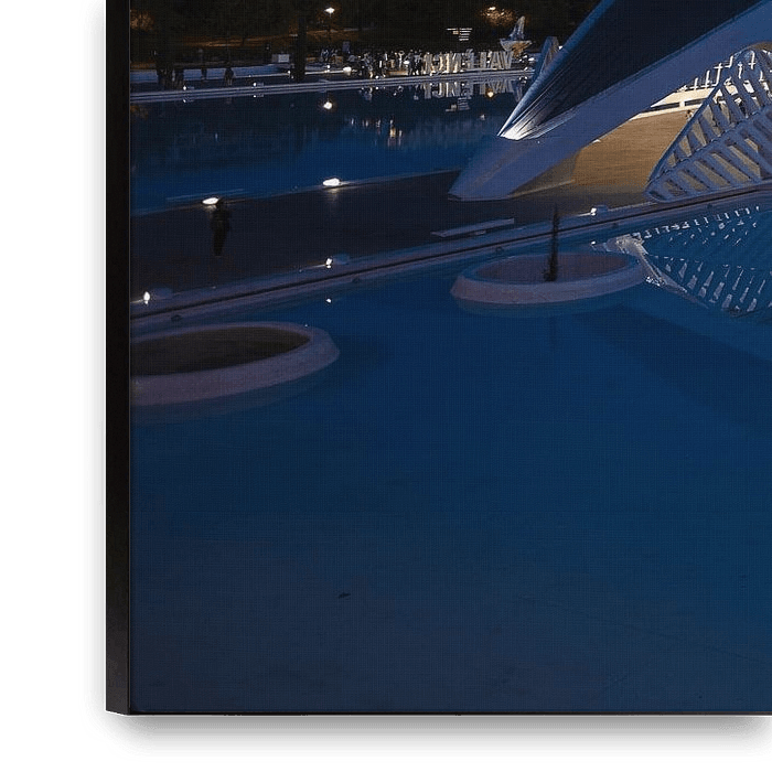 Dieses Nachtfoto wurde im Herzen der Stadt der Künste und Wissenschaften in Valencia aufgenommen, einem Ort, an dem moderne Architektur und Fantasie nahtlos ineinander übergehen. Im Vordergrund sehen wir das Hemisfèric, das diesmal in tiefblaues Abendlicht getaucht ist. Die Glasfassade leuchtet warm von innen und spiegelt sich perfekt…