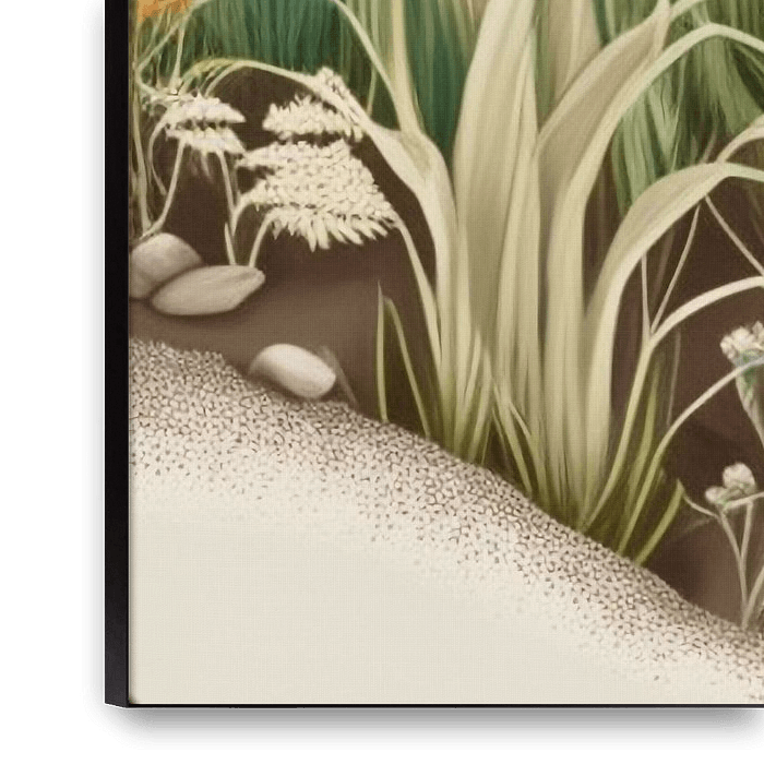 Diese erdige Komposition fängt eine Vielzahl von Wildpflanzen und Gräsern in ihrer natürlichen Form ein und hebt die verschiedenen Formen, Texturen und Farbtöne des ungezähmten Laubes hervor. Verstreute Felsen am Boden verleihen der Szene Tiefe und Realismus. Dieses Kunstwerk ist perfekt für Naturliebhaber und bringt einen Hauch von…