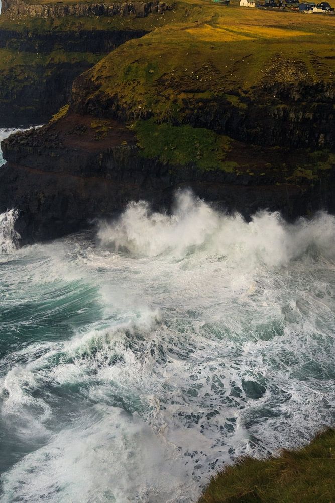 Die großen Wellen des Ozeans schlagen gegen die hohen Klippen der Färöer-Inseln.