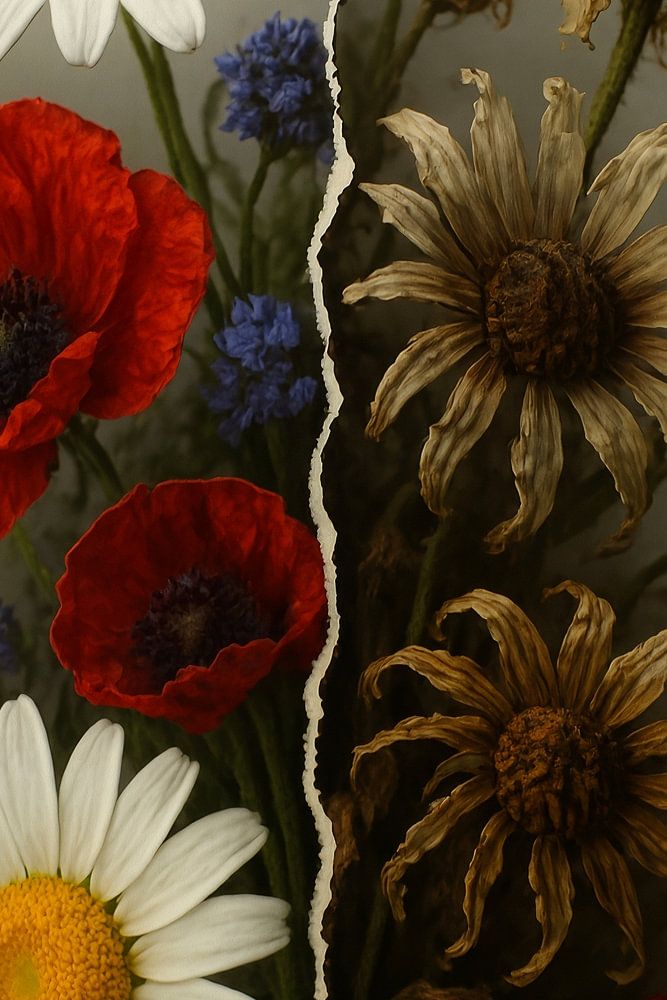 Dieses faszinierende Bild stellt die Dualität von Schönheit und Vergänglichkeit dar, mit leuchtenden Blumen auf der einen und verwelkten Exemplaren auf der anderen Seite, die zusammen den Kreislauf des Lebens darstellen.