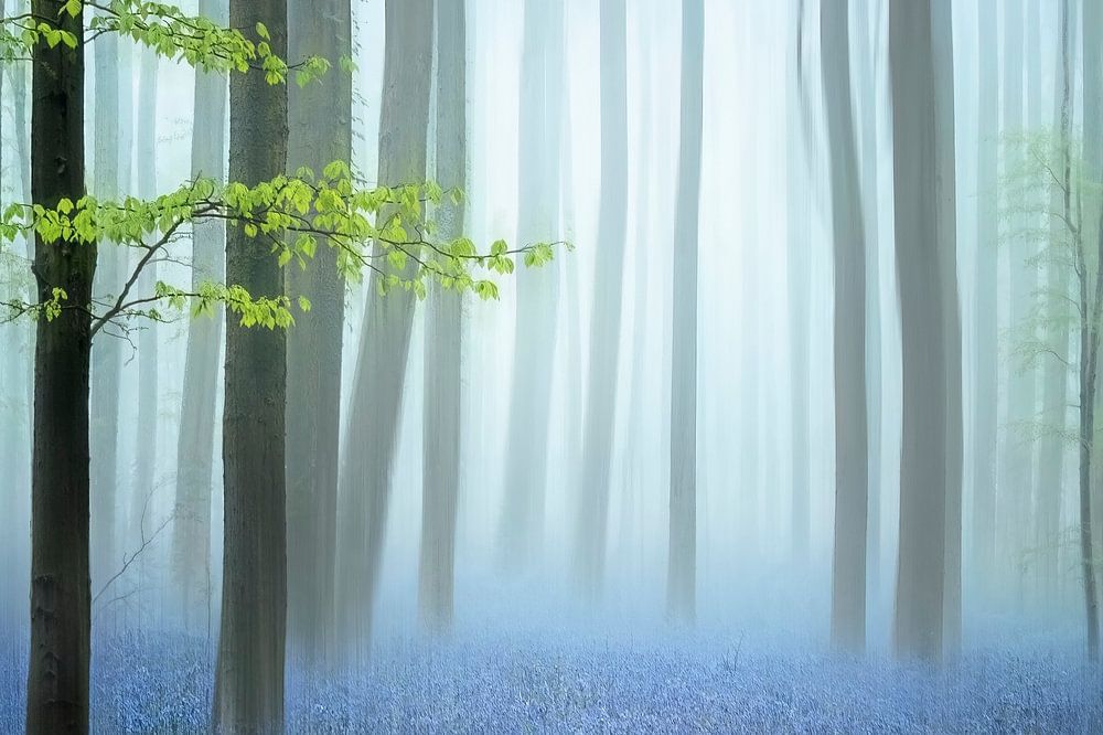 Der Haller in Belgien ist im Frühjahr blau gefärbt mit Glockenblumen, zusammen mit den nebligen Bedingungen landet man in einer märchenhaften Welt.