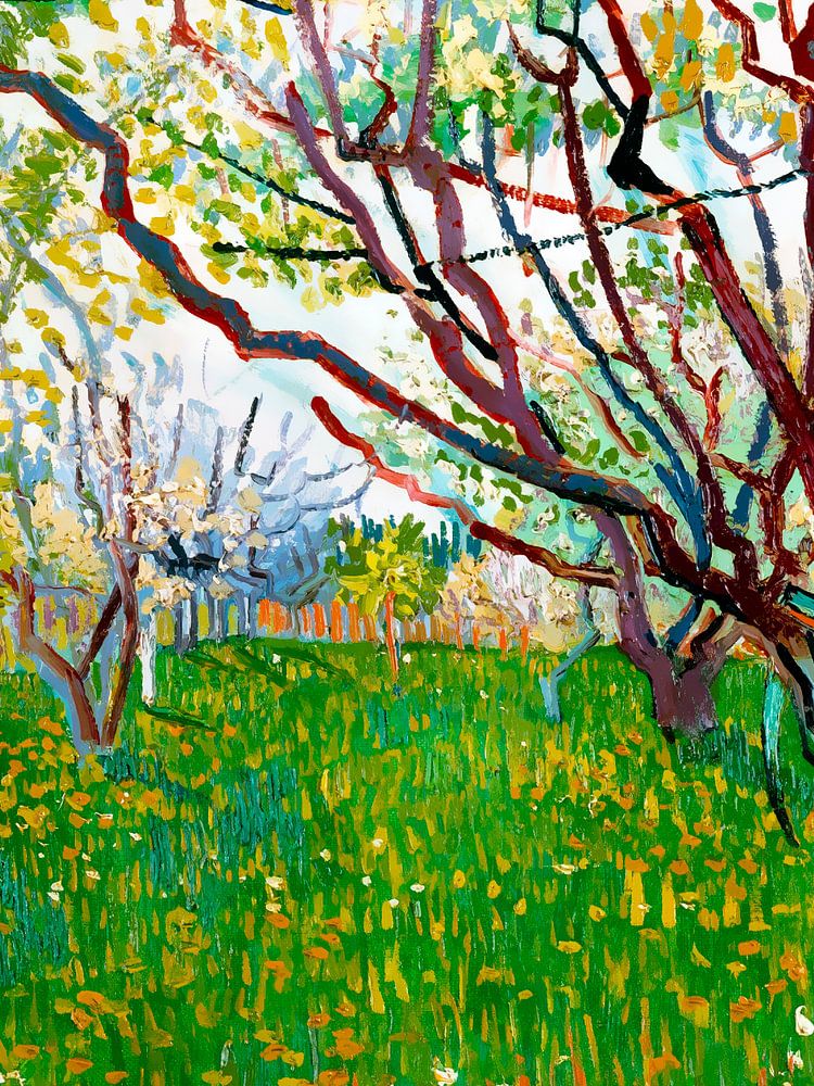 Eine genaue Darstellung des Originalgemäldes Vincent van Goghs blühender Obstgarten von 1888.