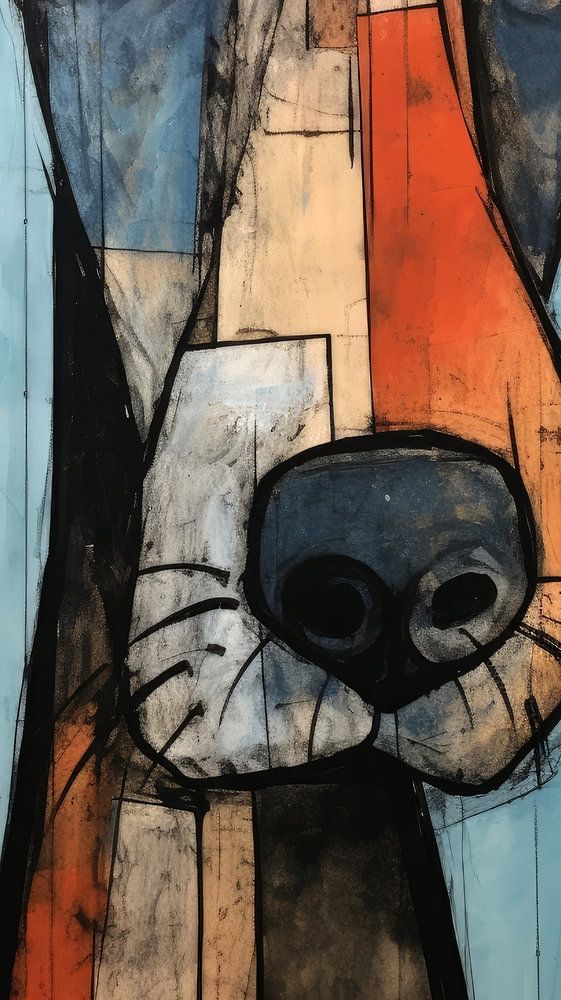 Die Aufmerksamkeit wird sofort von den Augen des Hundes angezogen, die eine tiefe Emotion widerzuspiegeln scheinen. Die verschiedenen Farbbereiche - von erdigen Brauntönen über kühle Blautöne bis hin zu einem Hauch von warmem Orange - verleihen dem Werk eine lebendige Dynamik. Die Schattierung und Textur der Farbe suggerieren eine Tiefe und Komplexität, die über die zweidimensionale Ebene hinausgeht. Dieses Porträt strahlt eine gewisse Würde und Ruhe aus und bietet gleichzeitig einen Einblick in die Seele des Hundes, die sowohl kraftvoll als auch sanft erscheint.