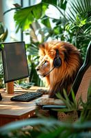 Mit majestätischer Gelassenheit sitzt der Löwe im grünen Dschungel seines Büros, das von üppigen Pflanzen umgeben ist. Ein Headset ziert sein stolzes Haupt, während seine kräftigen Pfoten die Tastatur berühren. Der Kontrast zwischen der wilden Schönheit und der modernen Technologie schafft eine faszinierende Symbiose zwischen Natur und…
