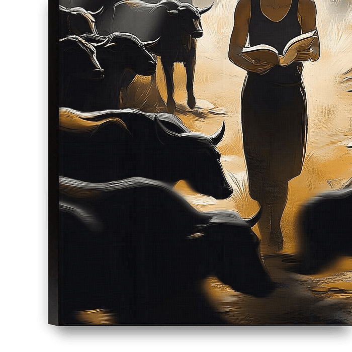 „The Literate Herder“ fängt eine tiefgreifende Überschneidung von Intellekt und Instinkt, Einsamkeit und Gesellschaft ein. Eine einsame Figur, die in ein Buch vertieft ist, schreitet ungestört durch eine tosende Büffelflut - eine allegorische Komposition zwischen Wissen, Macht und Harmonie mit der Natur.