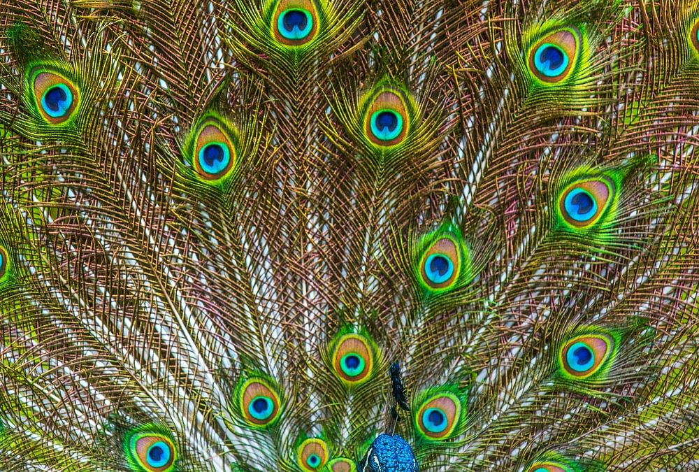 Männlicher Pfau zeigt sein Gefieder