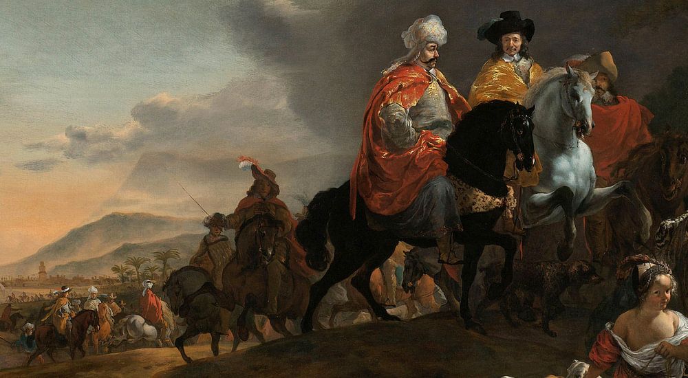 In den Jahren 1651-1652 reisten Botschafter Joan Cunaeus und sein Sekretär Cornelis Speelman nach Esfahan in Persien, um den Handel mit Pferden und Seide zu fördern. Speelman beschrieb die Tour, die luxuriösen Empfänge und Besuche an antiken Orten. Beide Herren werden hier wahrscheinlich vom Sultan von Bandar Abbas begleitet. Cunaeus trägt ein Seidengewand, ein Geschenk des Schahs.