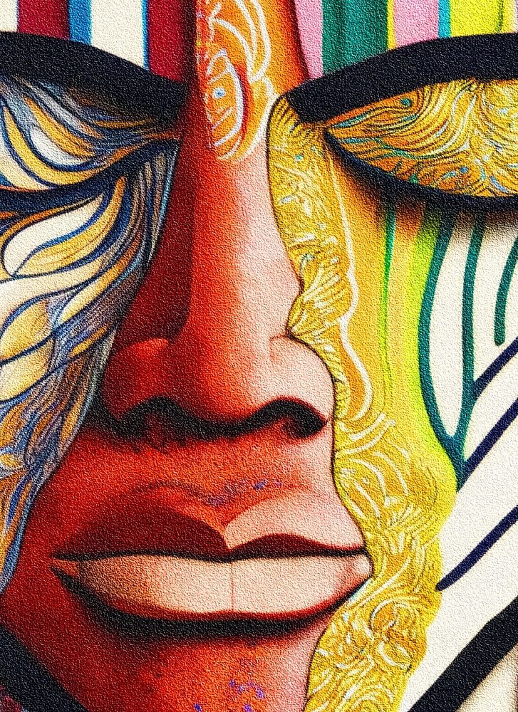 In einem ruhigen Dorf, umgeben von einer malerischen Landschaft, lebte eine Künstlerin namens Maria. Eines Tages fand sie eine geheimnisvolle Leinwand mit einem Gesicht, dessen Augen geschlossen waren, aber der Rest des Gesichts leuchtete in allen Farben des Regenbogens.