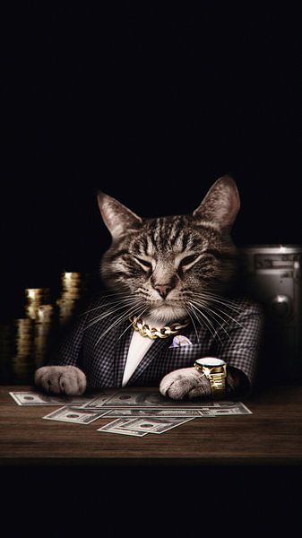 Eine getigerte Katze, der ultimative Finanzboss, sitzt in einem scharfen Anzug und einer dicken Goldkette, umgeben von Bargeld und Stapeln von Münzen. Die Raubkatze des Glücks.