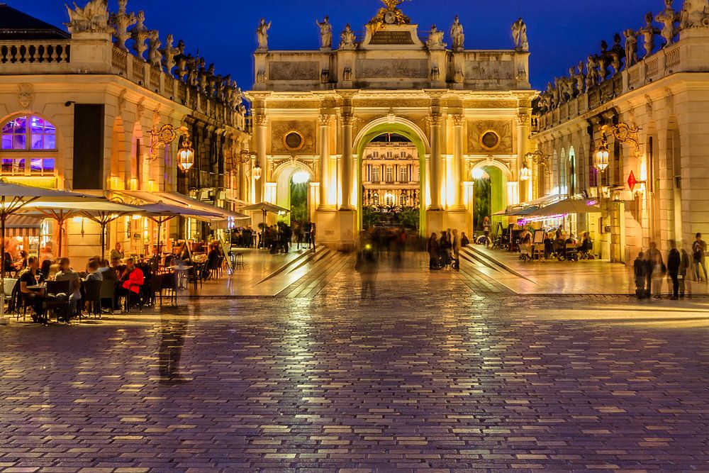 Im Herzen der Stadt Nancy befindet sich der wunderschöne Palast von Stanislas in der Region Lothringen in Frankreich. Am Abend verwandelte sich dieser Platz in eine Märchenwelt mit wunderschön beleuchteten Denkmälern und einem wunderschön beleuchteten Arc de Triomphe (Triumphbogen).