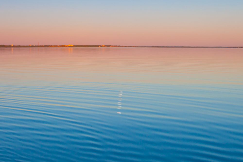 Der türkisfarbene See in der Morgendämmerung. Russland, Region Jaroslawl, die Stadt Pereslawl, der See Pleschejewo. glatte blaue und türkisfarbene Seeoberfläche in der Morgendämmerung, rot und orange und himmelblau.