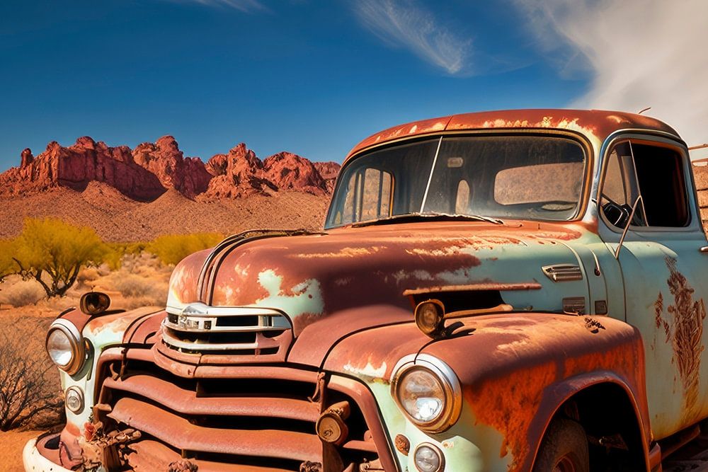 Ein alter Pick-up, der in der rauen Wüste in Arizona, USA, den Elementen ausgesetzt ist.