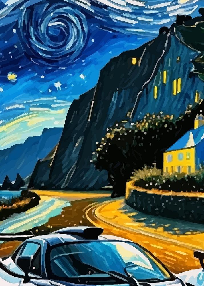 Der weiße Zonda R steht strahlend unter Van Goghs Himmel, seine Karosserie reflektiert die Konstellationen wie vom Feuer berührtes Elfenbein. Die Luft ist voller Bewegung - die Sterne wirbeln, die Nacht zittert - und doch bleibt das Auto wild und still, wie ein gemalter Gott der Geschwindigkeit. Es gehört nicht zu den Straßen, sondern zu den Visionen, eine in Kunst gehüllte Spektralform, regungslos in der Bewegung.