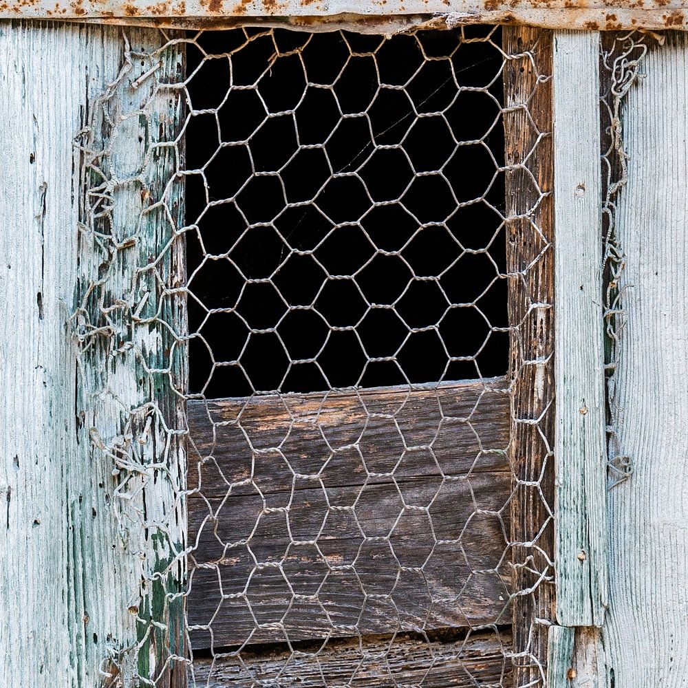 An dieser Tür waren rostige Metallplatten, verwittertes Holz und geheftetes Netz angebracht.