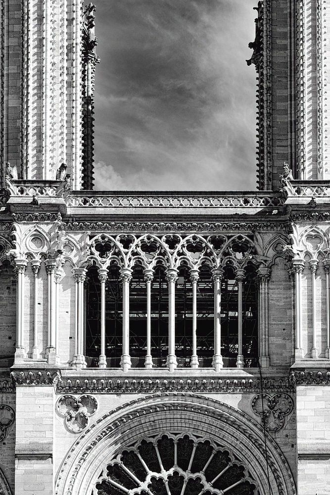 Die gotische Architektur zeigt sich in den komplizierten Details der Fassade einer großen Kathedrale. Zwillingstürme, Rundbogenfenster und eine Rosette bilden ein symmetrisches und imposantes Bauwerk, das sich vom Himmel abhebt.