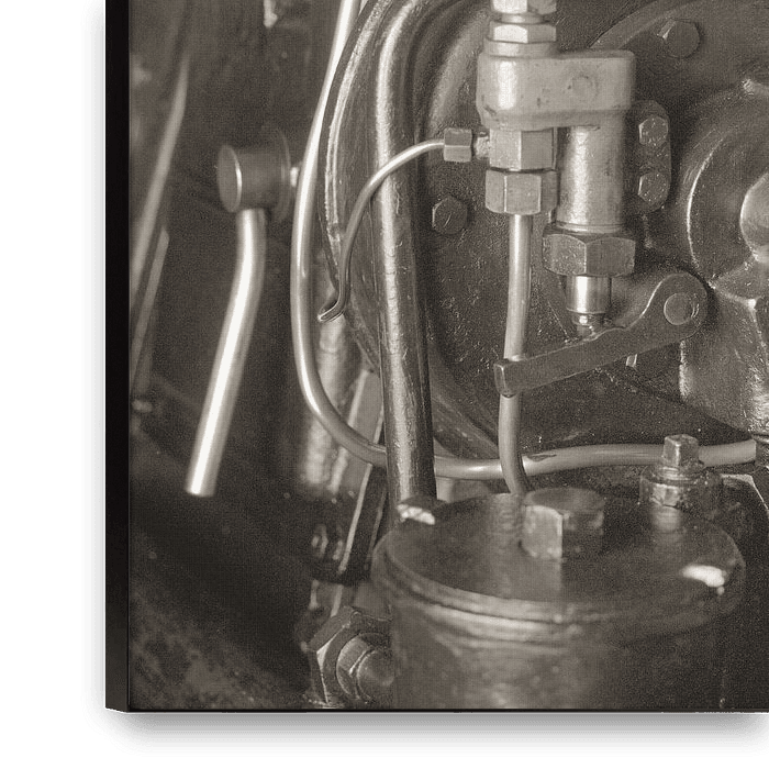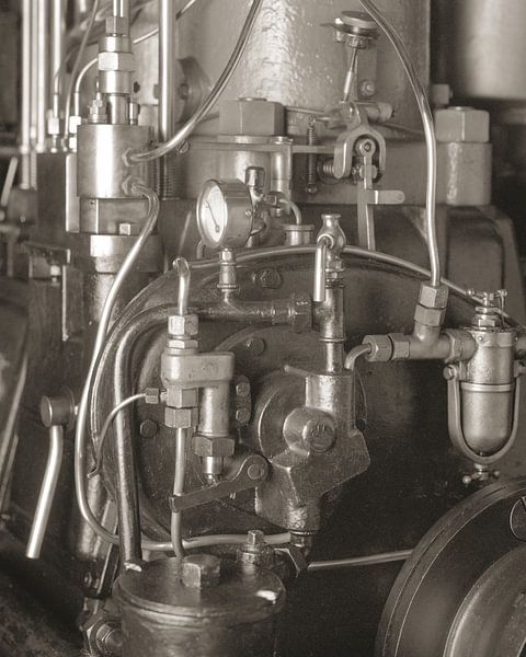 Bestelle das Foto Detailansicht eines historischen Schiffsmotors von Jan van der Schalie Analoge Fotografie als Reproduktion auf Leinwand, Alu-Dibond, als Poster, Fototapete oder Acrylglasbild.