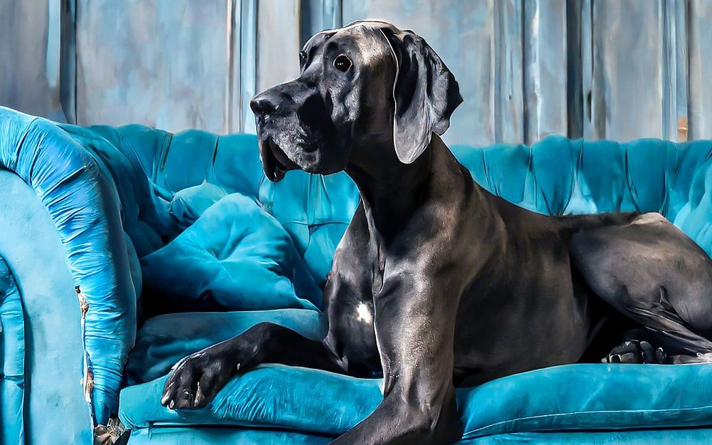 eine Deutsche Dogge liegt auf einem rampunierten alten Sofa und fühlt sich wohl. Dieses Bild ist nach meiner Vorstellung mit künstlicher Intilligenz generiert worden.