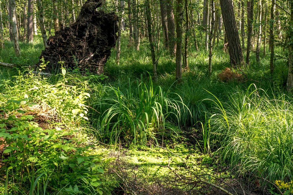 Moorwald, moor, wald, kräuter, gras, farn, Torf, gün, natur, bäume, laubwald, blätter, wasse, nass, naturschutz, Naturschutzgebiet, keine Menschen, Grün, Märchen, Wildnis, Atmosphäre, Licht, Sonnenstrahl, Sonne, Gegenlicht, Märchenwald, Waldboden