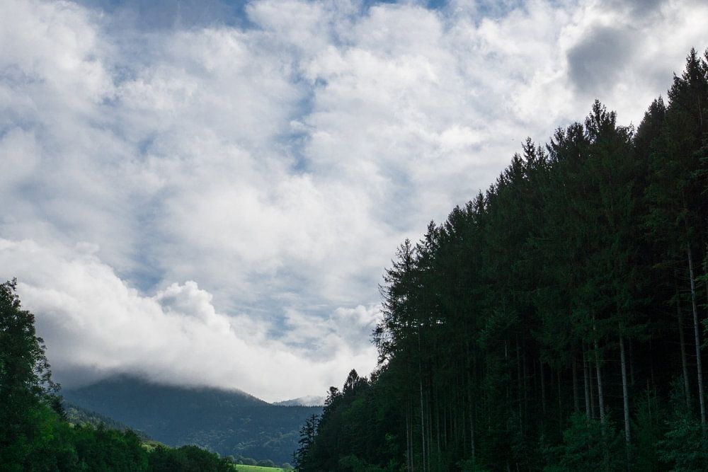 Deutschland - Tal durch Mischwald bei Freiburg mit grünem Gras und blauem Himmel