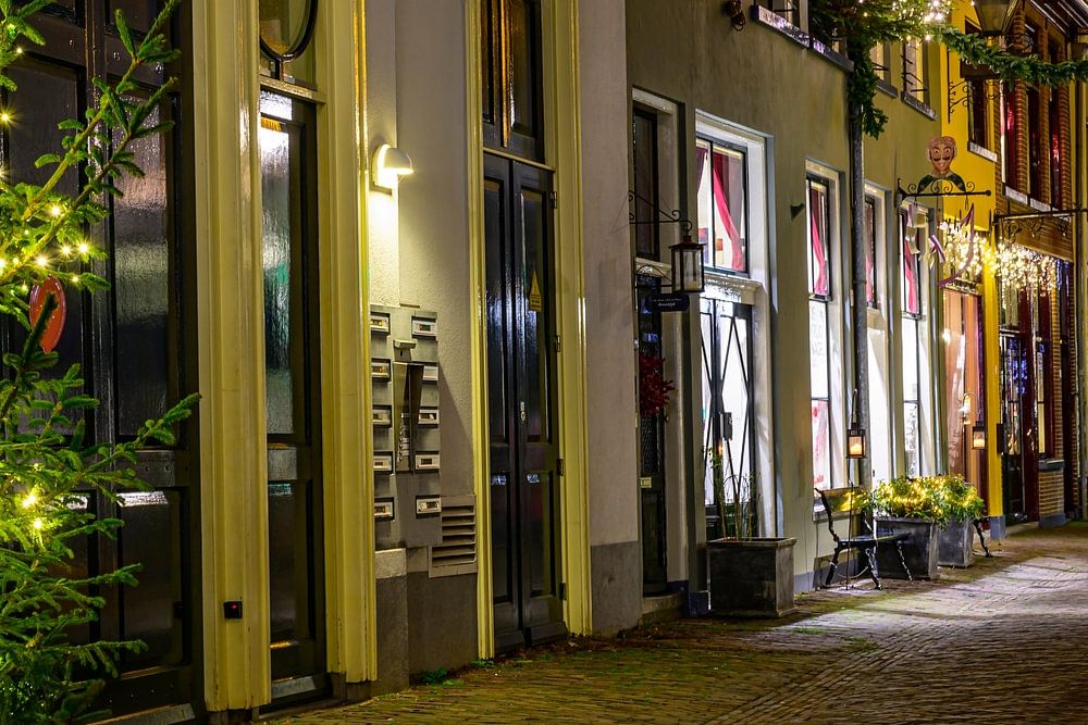 Winterliche Abendansicht von Deventer mit Weihnachtsdekoration in der Altstadt, die für das jährliche Dickens-Festival in der Vorweihnachtszeit bekannt ist.