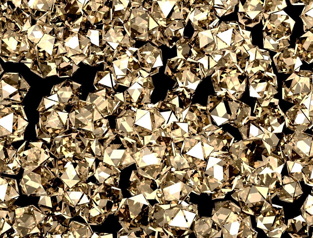 Das Bild "Diamanten sind für immer" zeigt eine Fülle geschliffener Diamanten, kunstvoll auf einem schwarzen Hintergrund verteilt und von einem sanften gelben Licht durchdrungen. Die Diamanten funkeln in ihrer Vielzahl wie Sterne in einer klaren Nacht.