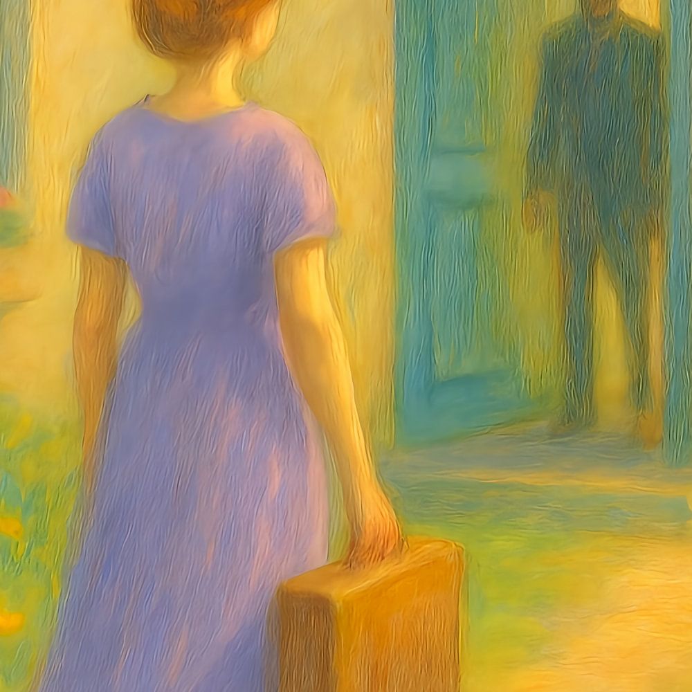 Eine Frau steht auf dem Gartenweg, ihren Koffer in der Hand. Die Haustür ist offen, ein Mann steht in der Tür. Sie schauen sich nicht direkt an. Die Distanz ist gering, aber spürbar. Das Haus ist warm, die Blumen blühen, aber was vor sich geht, bleibt unausgesprochen.