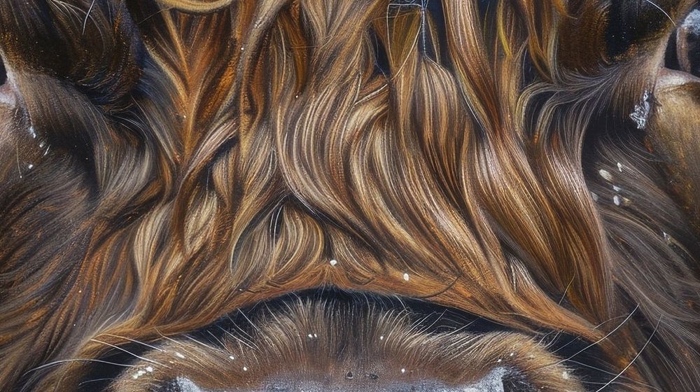 Dieses faszinierende Nahporträt fängt die Intensität eines schottischen Highlanders ein und konzentriert sich auf seine dunklen, reflektierenden Augen und das üppige, gewellte Fell, das ihm üppig über das Gesicht fällt. Die graue Nase und die subtilen Texturdetails verleihen dem Bild eine greifbare Realität, so als ob man dem Tier direkt in die Augen sehen würde. Die Kombination aus den warmen, erdigen Tönen des Fells und dem weichen Licht, das auf die Details fällt, macht dieses Kunstwerk zu einer intimen und kraftvollen Darstellung der Natur. Ideal für eine natürliche und rustikale Umgebung.