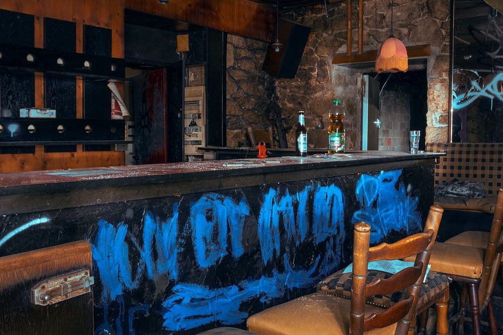 Entdecken Sie die verlassene Bar, in der die Besucher einst vor oder nach dem intimen Akt einen Drink zu sich nehmen konnten, in einem ehemaligen Erwachsenenclub in Deutschland voller Geschichten und Nostalgie.