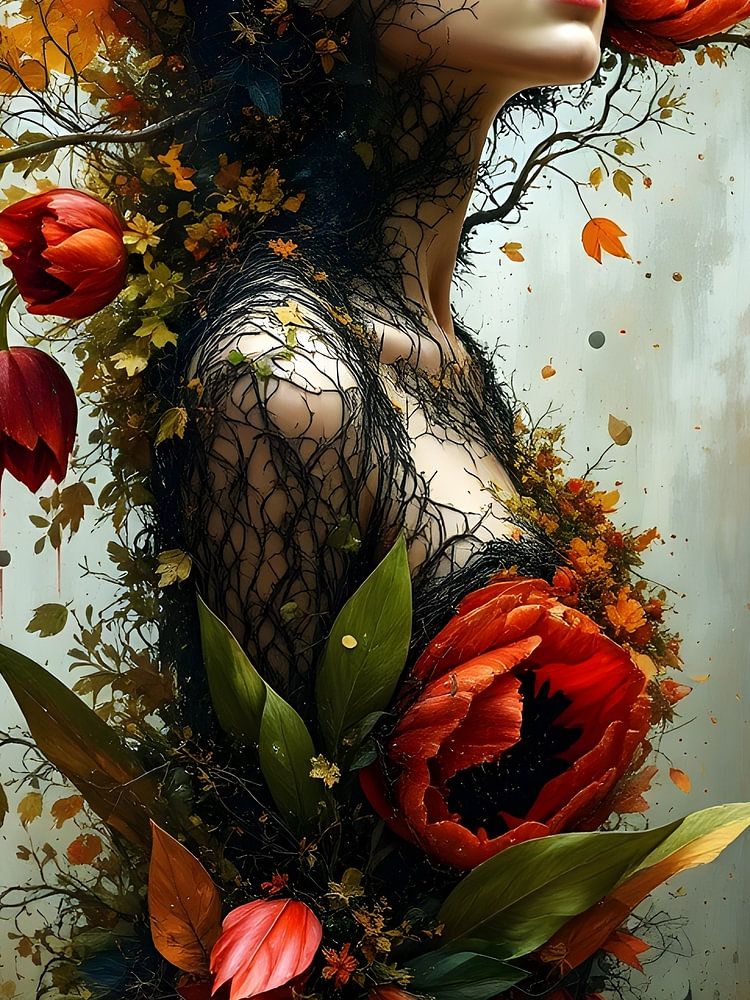 Ihr Körper erhebt sich aus einem Meer von bunten Tulpen, während ihr elegantes Kleid aus großen, leuchtenden Blättern besteht. Die Ärmel ihres Gewandes gehen anmutig in schlanke Äste und kleine Blätter über, als ob sie sich mit der Landschaft selbst vereinigen würden. Goldene Akzente fangen das Licht ein und verleihen dem Werk ein fast göttliches Aussehen.