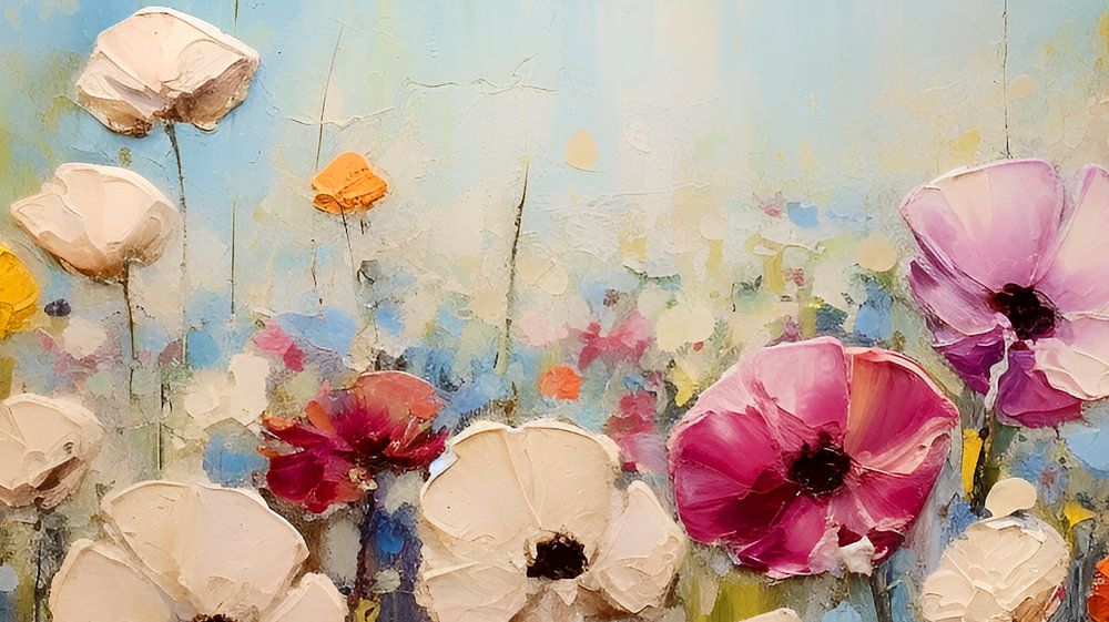 Ein KI generiertes Bild auf dem eine bunte leuchtende Blumenwiese dargestellt ist. Das Bild ist in abstraktem Stil erstellt und hat die Anmutung eines Ölbildes. Ein wunderschöner Hingucker in jedem Raum.