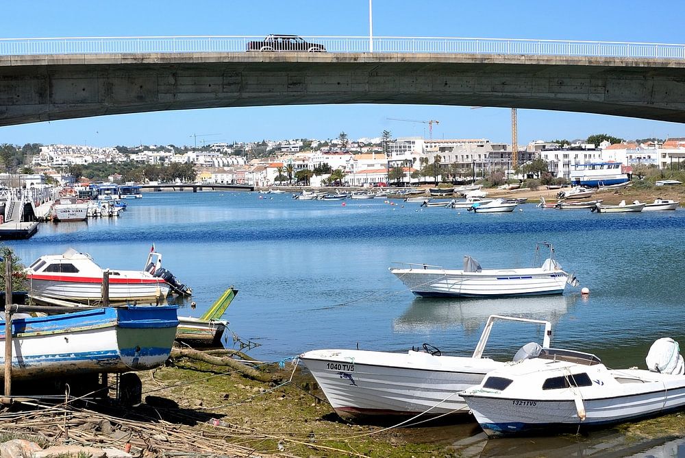Die Brücke über den Fluss Gilao verbindet die beiden Teile der Hafenstadt Tavira an der Algarve, Portugal.