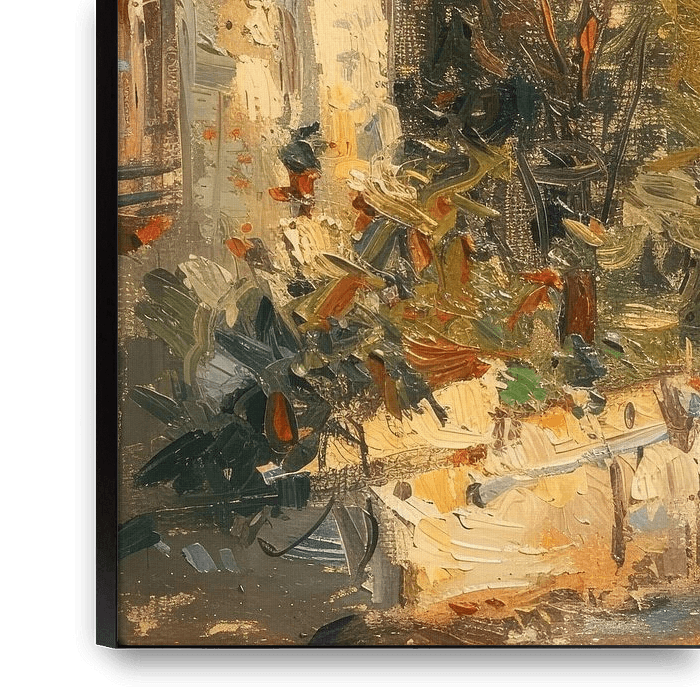 Mit dicken, dynamischen Pinselstrichen wurde eine Szene geschaffen, in der die Wärme des Sonnenuntergangs und der rustikale Charme der Pariser Dächer zum Leben erwachen. Die Komposition…