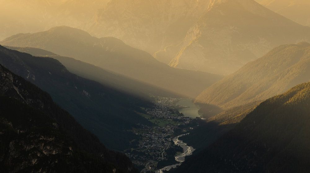 Die goldene Stunde in den Dolomieten in Italien. Dieses Foto ist im bekannten Gebiet Drei Zinnen mit seinen imposanten Gebirgen gemacht.